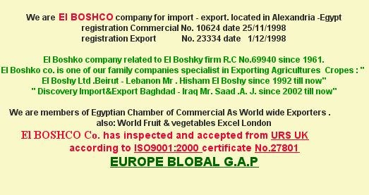 | Our main line is export and supply fresh vegetables from Egypt to world wide . In this career we are professionals. We also guarantees the quality , taste , condition and the price for the buyers or the importers . We trying to do our best to make the shipment fit the standard of world quality . So We pay more attention for Cleaning , Treating and packing the crops. Our packing materials do not constitute a food safety risk. We do not supply any genetically modified products. |